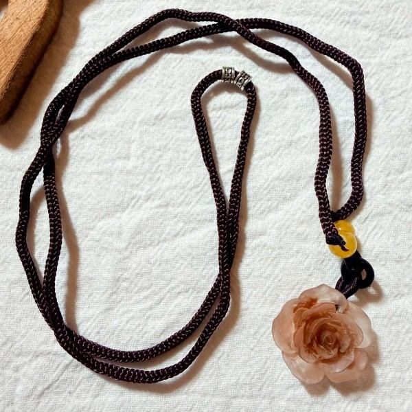 Material: dark brown nylon braided rope, paired with natural carved camellia pendant, yellow chalcedony spacer beads and alloy accessories.