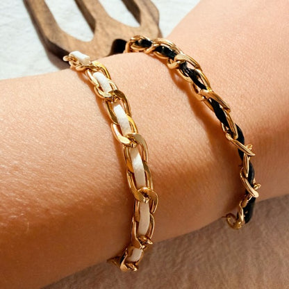 Handwoven in classic black and white, each bracelet is intertwined with a fine gold chain and finished with a gold extension chain for an adjustable fit. Minimal yet refined, it carries a calm, effortless mood that sits naturally on the wrist.