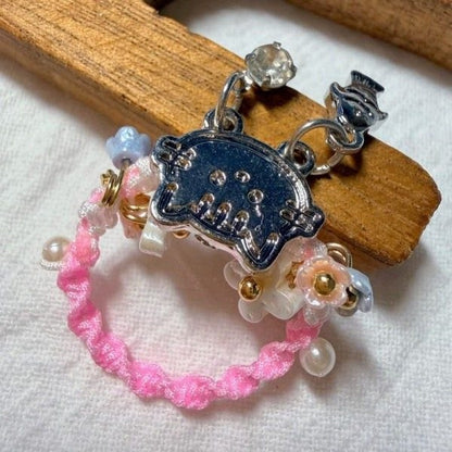 Handwoven with soft pink fibers, the ring features a silver kitty, a tiny silver fish charm, and a small translucent bead, accented with delicate pink, blue, and white flowers. Light and playful, it adds a gentle touch of whimsy to your everyday moments.