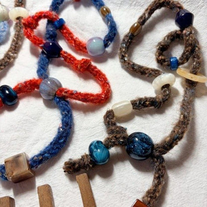 Handwoven with care, each chain is adorned with sparkling glass beads in unique patterns, adding subtle shimmer to your outfit. Handwoven with care, this chain is adorned with sparkling glass beads in unique patterns, featuring colors like warm brown, light blue, deep brown, and deep blue with red — each bringing cozy sophistication and subtle energy to your look.